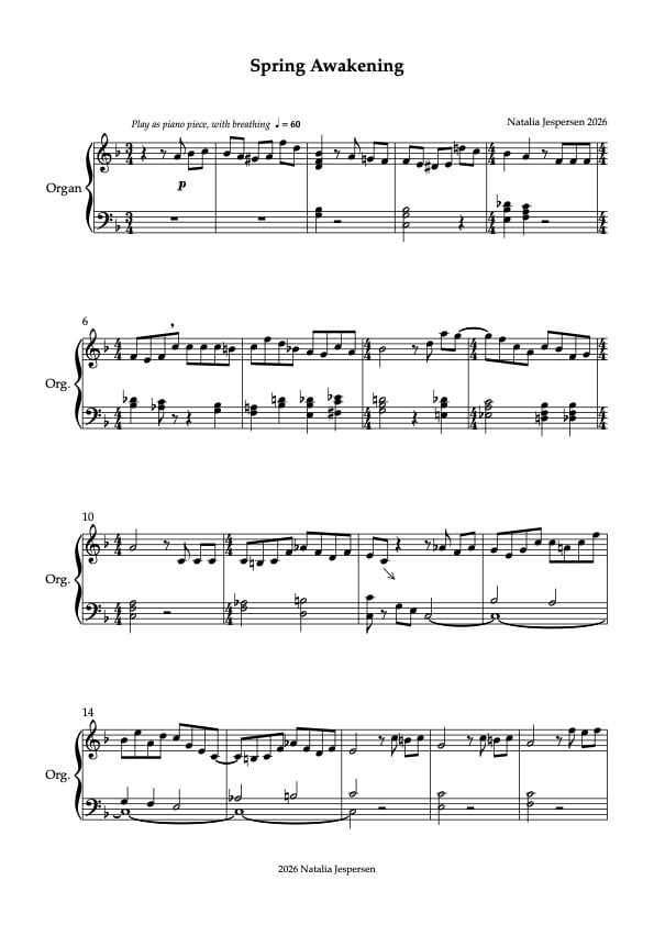 Natalia Jespersen (b. 1968) was born in St. Petersburg, Russia and educated in music there. In 2001, she emigrated to Denmark and studied organ from 2003-07. Jespersen has served as organist for churches in Holstebro, Denmark. As a composer, she has written more than 300 works for organ and piano.